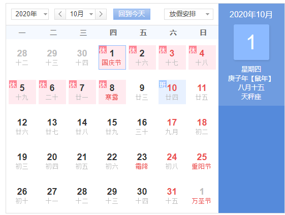 2020年中秋国庆节放假安排